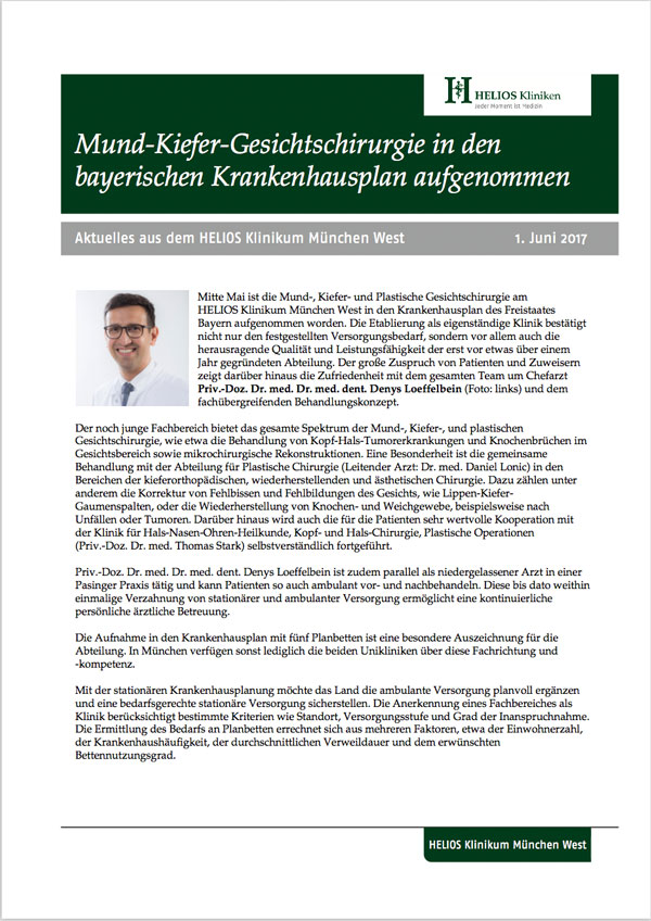 In einer Pressemitteilung berichtet das HELIOS Klinikum München West über die Aufnahme der Abteilung für Mund-Kiefer-Gesichtschirurgie von Chefarzt Dr. Dr. Denys Loeffelbein in den bayerischen Krankenhausplan.