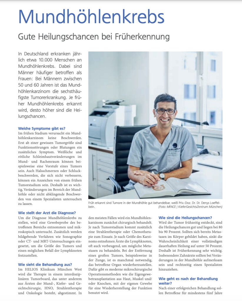 Unser Mund-Kiefer-Gesichtschirurg PD Dr. Dr. Loeffelbein erklärt im Interview mit der Patientenzeitschrift Gesund in München West, welche Risikofaktoren und Anzeichen es für Mundhöhlenkrebs gibt.