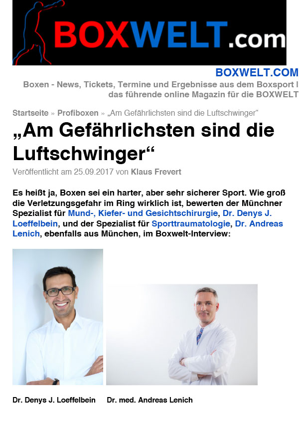 Mal ein etwas anderes Interview: Über die Verletzungsgefahren im Boxsport haben unser MKG-Chirurg Dr. Dr. Loeffelbein und sein Kollege, der Sporttraumatologe Dr. Andreas Lenich, mit dem Online-Magazin boxwelt.com gesprochen.