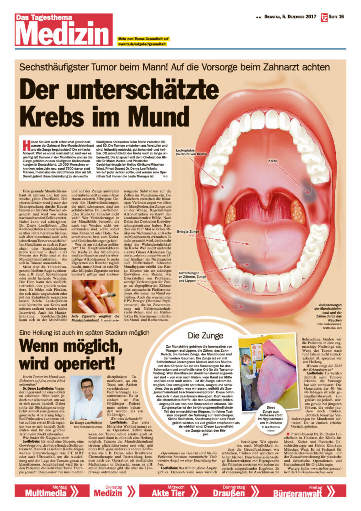 Die Münchner tz hat mit unserem Mund-Kiefer-Gesichtschirurgen PD Dr. Dr. Loeffelbein über die Erkennung und Heilung von Tumoren in der Mundhöhle gesprochen.