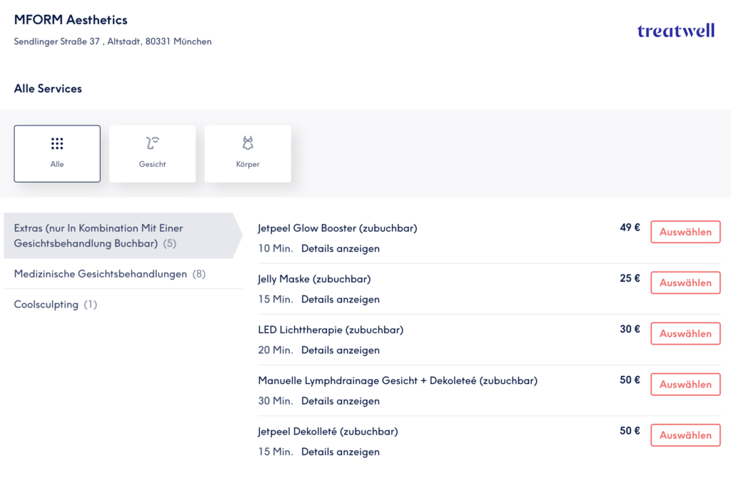 Die Buchung einzelner Behandlungen kann bequem über die Online-Maske von treatwell erledigt werden.